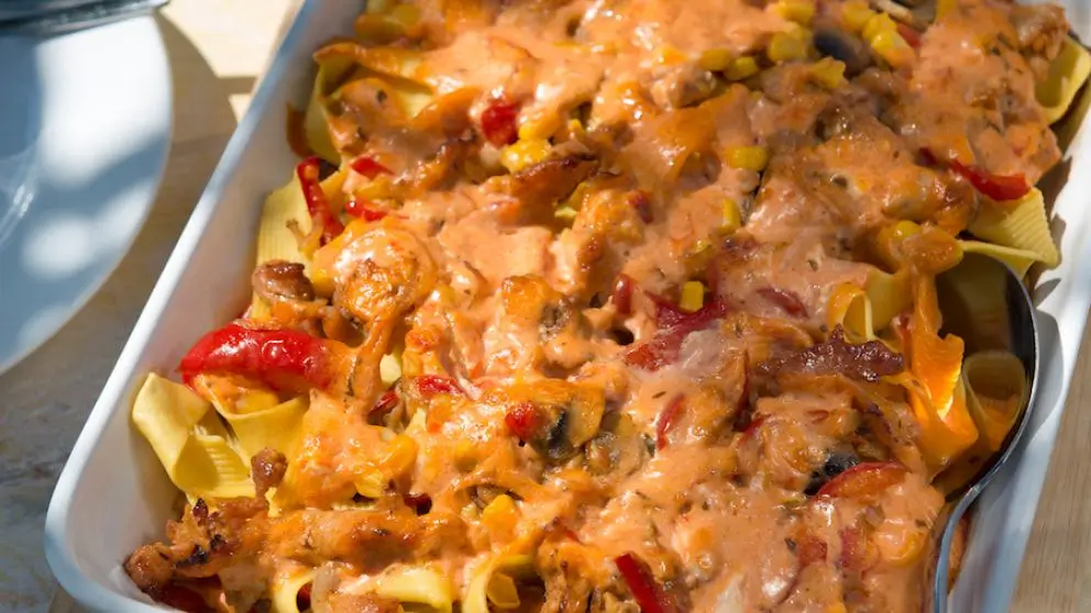 Wenn die Nudeln fertig sind, diese abgießen, in eine Auflaufform geben und eine Lage Käse darauf streuen. Darauf kommt das Fleisch und dann der restliche Käse. Jetzt gießt man die Sauce Hollandaise über alles und schiebt die Form in einen auf 210 Grad vorgeheizten Backofen für ca. 20 Minuten.