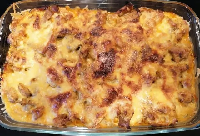 Wenn die Nudeln fertig sind, diese abgießen, in eine Auflaufform geben und eine Lage Käse darauf streuen. Darauf kommt das Fleisch und dann der restliche Käse. Jetzt gießt man die Sauce Hollandaise über alles und schiebt die Form in einen auf 210 Grad vorgeheizten Backofen für ca. 20 Minuten.