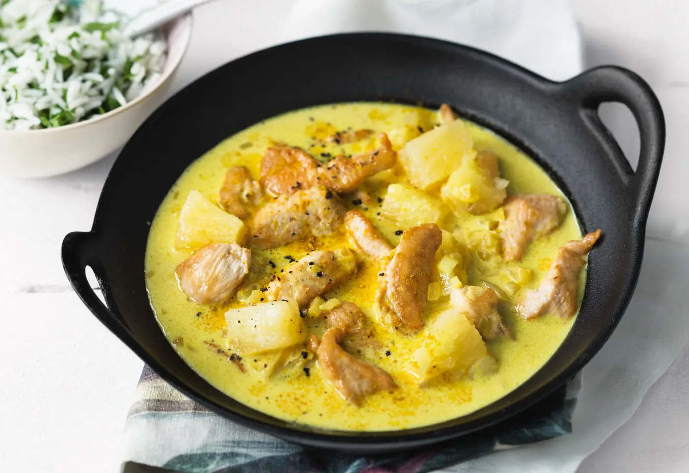 Ein Gericht, das sowohl das Herz als auch den Gaumen erfreut – das Hähnchen-Ananas-Curry mit Reis. Diese exquisite Kombination aus zartem Hühnerfleisch und süßer Ananas, verfeinert mit cremigem Curry, bietet ein einzigartiges Geschmackserlebnis. Es verbindet die Leichtigkeit des Hähnchens mit der exotischen Süße der Ananas und den intensiven Aromen des Currys zu einem harmonischen Ganzen.