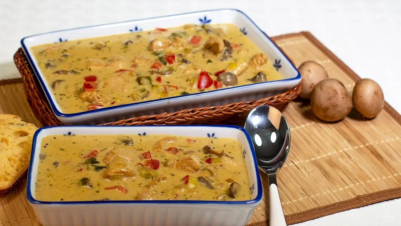 Die angebratenen Hähnchenstücke mit der Margarine oder Butter wieder in die Pfanne geben und kurz erhitzen. Das Mehl und das Currypulver zugeben, kurz anschwitzen und dann mit der Brühe ablöschen. Den Streichkäse zugeben und bei mittlerer Hitze unter Rühren schmelzen lassen, die Sahne einrühren. Die vorbereitete Paprika-Zwiebel-Pilz-Mischung sowie den gegarten Lauch zugeben und mit der Teriyakisauce, der Currypaste und etwas Pfeffer abschmecken. Bei geschlossenem Deckel noch ca. 5 Min. bei kleiner Hitze durchziehen lassen, gelegentlich umrühren. Zum Schluss die Petersilie unterrühren und die Suppe heiß servieren.