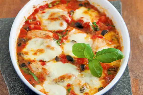 Jetzt den Teig mit geriebenem Käse und den Hähnchenfleischstücken vermengen und in eine mit Backpapier ausgelegte runde Backform geben. Danach mit Tomatenscheiben belegen.