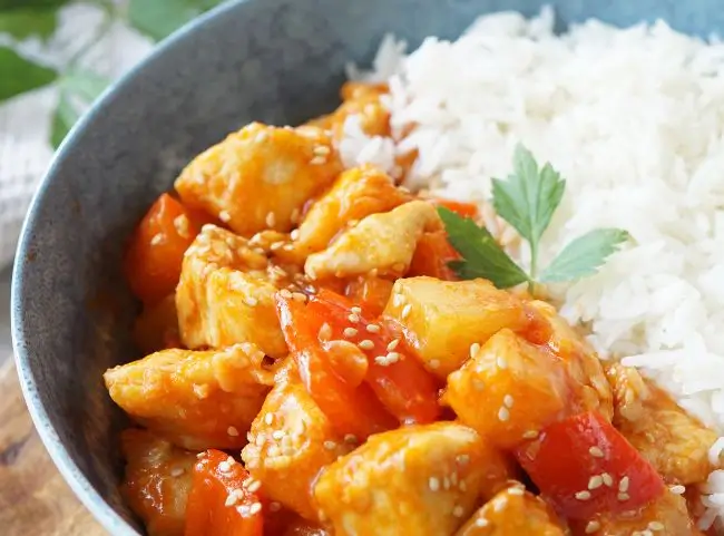 Die Zwiebel wird geputzt, halbiert und in feine Ringe geschnitten und in der Pfanne, in der die Hähnchenstücke waren, angebraten. Nun werden noch 2 Paprikaschoten geputzt und ebenfalls in mundgerechte Stücke geschnitten. Diese werden dann mit der Ananas zu den Zwiebeln gegeben und 5 Minuten mitgebraten. Dann wird die Sauce dazu gegeben und alles weitere 3 Minuten auf mittlerer Hitze geköchelt. In der Zwischenzeit werden die letzten 2 EL Speisestärke mit ca. 80 Milliliter des Ananassaftes angerührt und dann in die Pfanne gegeben. Danach wird alles wieder auf dem Herd geben um etwas zu reduzieren.