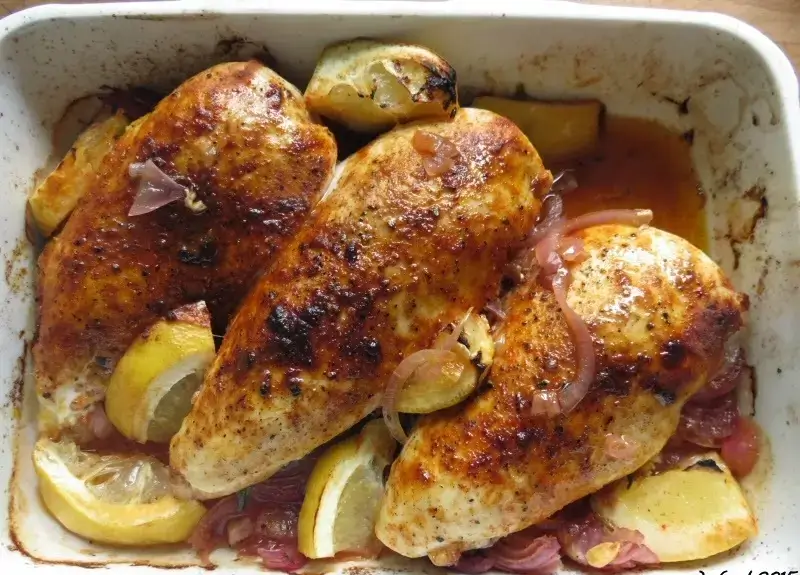 Wir schneiden gekochte Eier in eine Schüssel, pressen ein paar Knoblauchzehen aus. Wir fügen auch die Gewürze, das Dressing mit Mayonnaise und das Rühren hinzu. Das Tablett mit Sonnenblumenöl schmieren, das Hähnchenfilet darauf legen und den Salat darauf verteilen. Reibkäse großzügig bestreuen und in den Ofen schieben.