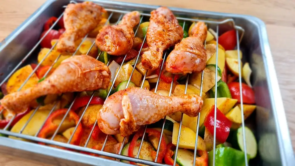 Anschließend das klein geschnittene Gemüse zu den Kartoffeln in die Pfanne geben und nochmals weitere 15 Minuten in den Ofen. In der Zwischenzeit den Schmand und den Joghurt verrühren. Die Knoblauchzehen dazupressen, den Schnittlauch unterrühren und kräftig mit Salz und Pfeffer würzen. Nach ca. 35-40 Minuten die Hähnchenschenkel mit dem Ofengemüse servieren und die Schmandcreme dazureichen.