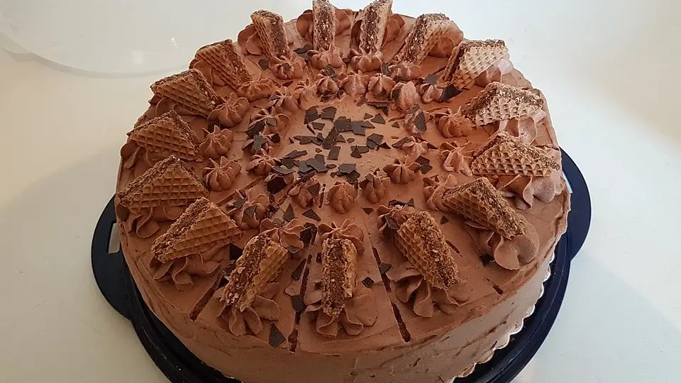 Dann die Sahne steif schlagen und die Torte damit rundherum einstreichen. Mit Mini-Hanuta und der restlichen Nutellacreme garnieren. Am Rand Raspelschokolade aufstreuen.