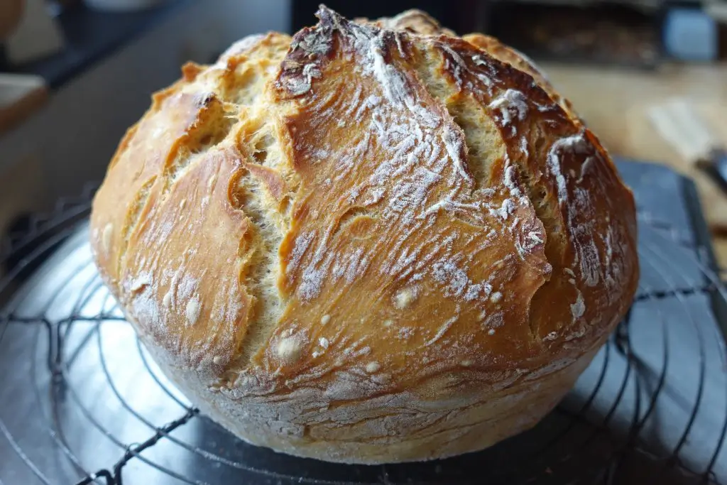 Jetzt den Topf mit etwas Mehl bestreuen, dann vorsichtig das Brot in den Topf einlegen, den Ofen auf 210°C runter schalten, mit dem Deckel 30min backen