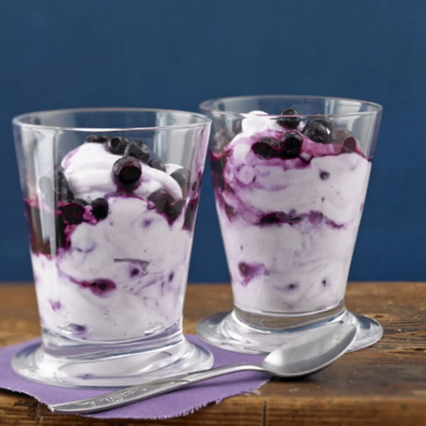 Das abgekühlte Beerenmus über die Creme geben, mit Schlagobers und ein paar Heidelbeeren verzieren, kühl stellen