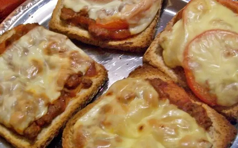 Den Blech herausnehmen und Toasts mit Zwiebelringen, Tomatenscheiben und Käsescheiben belegen.