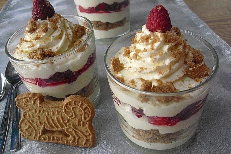 In einer ausreichend hohen eckigen oder runden Schüssel mit drei, vier EL Creme den Boden bedecken. Darauf eine Schicht Spekulatius, ganz oder in Stücke gebrochen, verteilen. Die Hälfte der restlichen Creme darauf verstreichen. Die gefrorenen Himbeeren darüber verteilen, diese mit dem Rest der Creme bedecken, so dass sie nicht mehr zu sehen sind. Zerbröckelten Spekulatius (Menge nach Belieben) darüber verteilen.