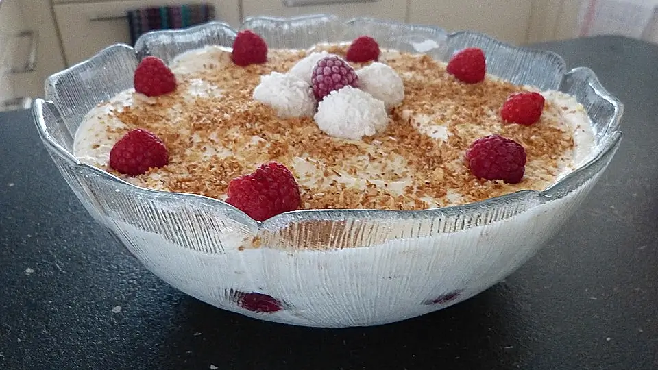 Quark und Joghurt mit dem Zucker verrühren. 1 Liter Sahne steif schlagen und unter die Quarkmasse heben und die Sahne-Quarkmasse auf die Himbeeren streichen. Zum Schluss den braunen Zucker über die Masse geben und die Nachspeise mindestens 8 Stunden an einem kühlen Ort durchziehen lassen.