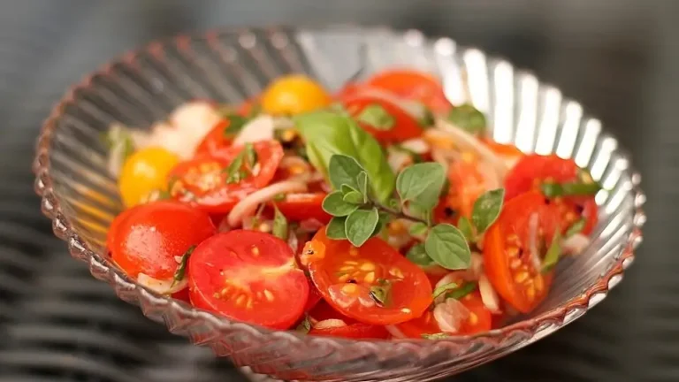 2. Dann alles zusammen in eine Schüssel geben (mit eventuellem Saft von den Tomaten), salzen und pfeffern, Basilikum dazu geben. Mit Öl beträufeln.