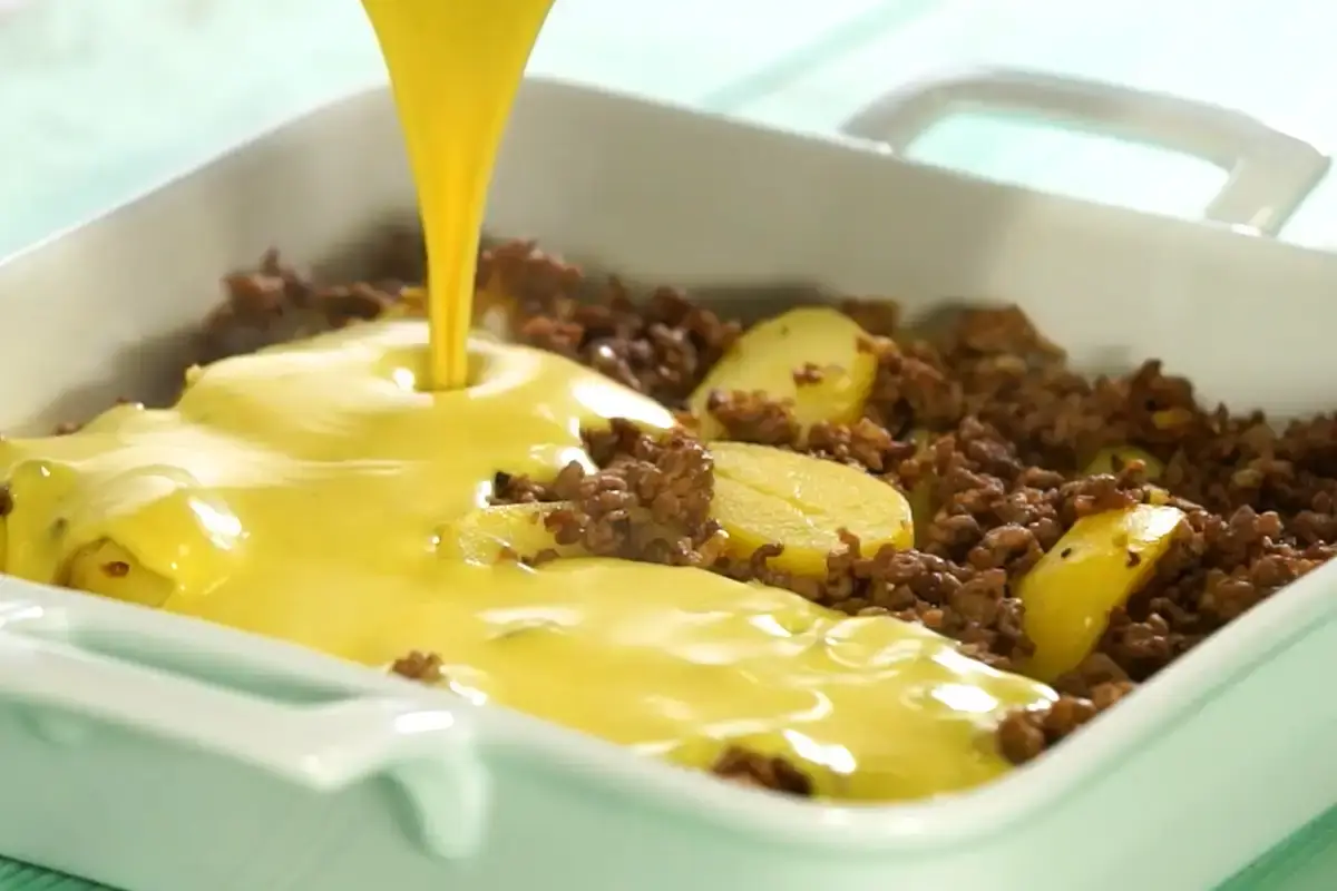 1. Kartoffeln waschen und 20 Minuten in kochendem Wasser garen. Zwiebel schälen und hacken. Hackfleisch und Zwiebel in heißem Öl grob stückig anbraten. Mit Salz, Pfeffer und Paprika würzen.2. Fett schmelzen. Mehl darin anschwitzen. Curry darüberstäuben. Mit Brühe und Sahne unter Rühren ablöschen. Käse zugeben. Mit Salz, Pfeffer und Curry abschmecken. Kartoffeln abgießen, abschrecken, pellen und eventuell halbieren.3. Kartoffeln, Hackfleisch und Soße in eine Auflaufform geben. Im vorgeheizten Backofen (E-Herd: 225 ° C/ Gas: Stufe 4) goldbraun überbacken. Thymian waschen, von den Stielen zupfen und über den Auflauf streuen und servieren.