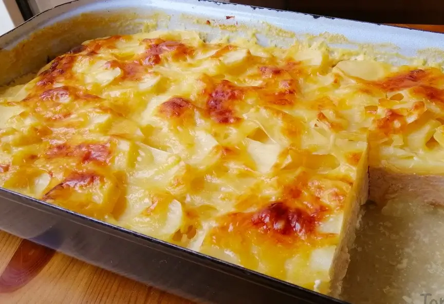 Den Backofen auf 200 Grad vorheizen. Die Kartoffeln waschen und ca. 20 Minuten in der Schale kochen. Schälen und in Scheiben schneiden.Die Zwiebel schälen und in Würfel schneiden.