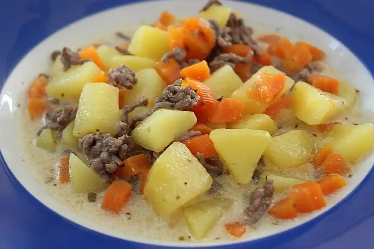 Wenn die Kartoffeln und die Möhren gar sind, die Brühe gut zur Hälfte abgießen und auffangen. Dann das Hackfleisch mit in den Topf geben. Bei kleiner Flamme warm halten und alles vermischen. Dann den Schmand unterheben.