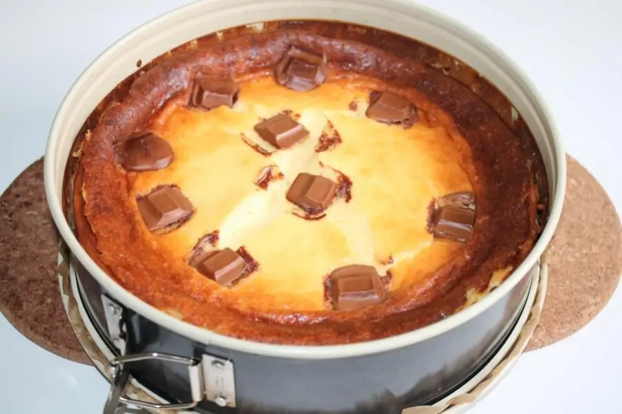 In der Zwischenzeit die Eier trennen und das Eiweiß steif schlagen. Das Eigelb in einer zweiten Schüssel mit Quark, Crème fraîche, Zucker, Vanillezucker und Vanillepuddingpulver verrühren. Dann das Eiweiß unterheben. Die Masse auf den Boden geben und die Kinderriegel in kleinen Stückchen darauf verteilen.