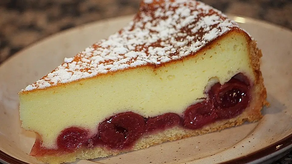 Ofen auf 180 Grad (Umluft 160 Grad) vorheizen. Den Mürbeteig auf einem tiefen, mit Backpapier ausgelegten Blech ausrollen, dabei einen Rand hochziehen. Kirschkompott klecksweise darauf verteilen und die Quarkmasse darüber streichen. Im Ofen 45-50 Min. backen.
