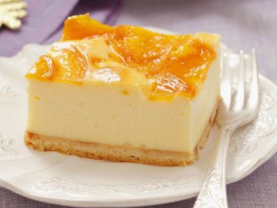Dann das geschlagene Eiweiß auf die Pfirsichschicht auslegen.