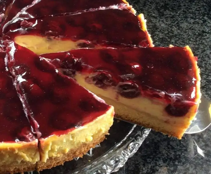 Den Guss aus Kirschsaft und Tortenguss (nach Packungsanleitung) herstellen und auf dem Kuchen verteilen.