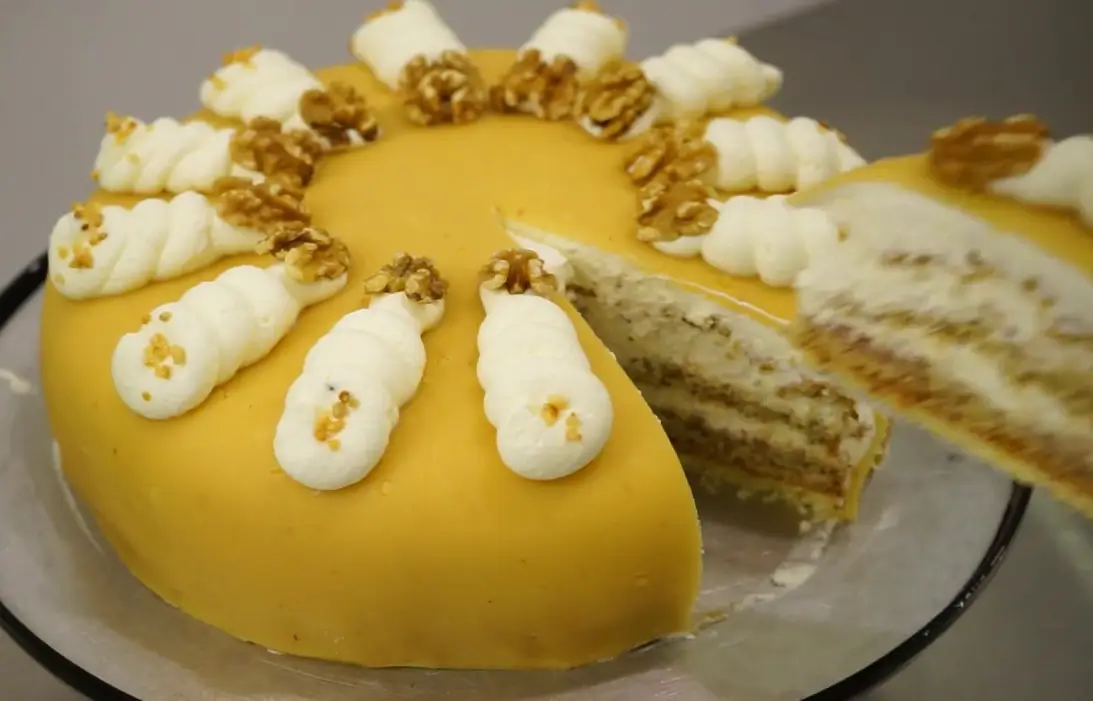 Marzipandecke vorsichtig über die Torte legen, etwas andrücken und überlappende Ränder mit einem Messer abschneiden. Mit einer angefeuchteten Tortenpalette oder einem großen Messer glattziehen und mit Walnüssen garnieren.
