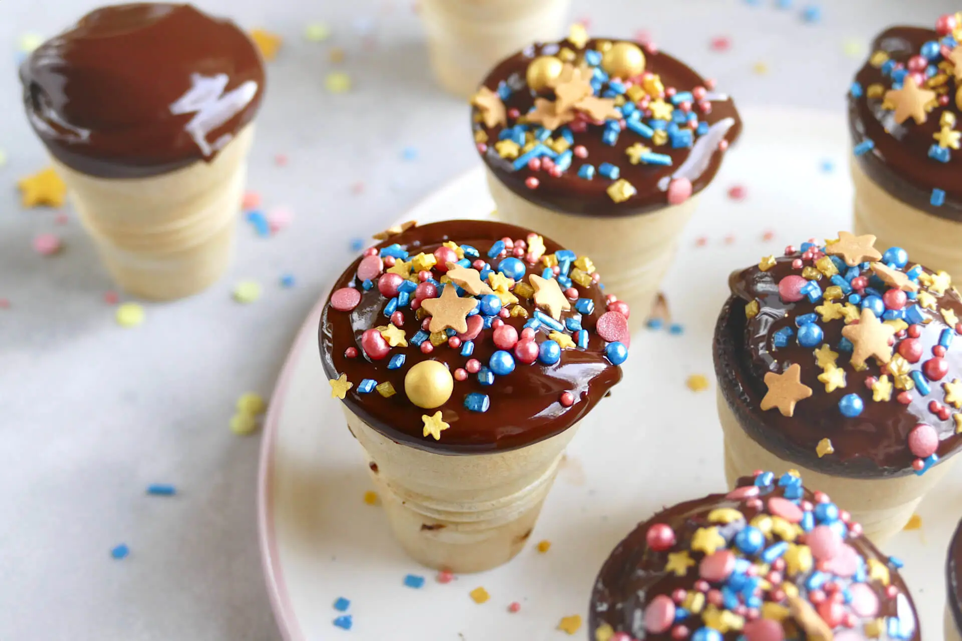 Den Backofen auf 180°C Ober-/Unterhitze (Heißluft: 160°C) vorheizen. Ein Backblech mit Backpapier belegen und die 24 Waffelbecher darauf stellen.