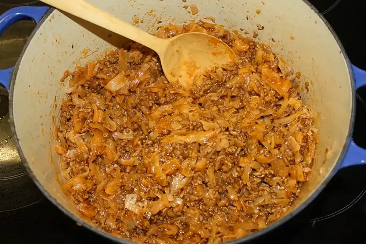 Tipp: Als Variante kann man auch gewürfelte rohe Kartoffeln dazu geben und als Eintopf kochen. Schmeckt wie Kohlrouladen, ist aber mit weniger Arbeit verbunden.