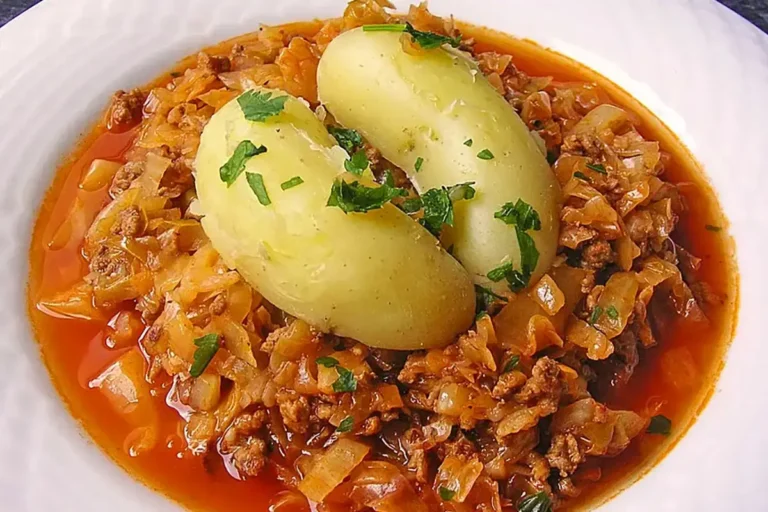 Das Gehackte so lange kräftig anbraten, bis es krümelig ist. Zwiebel würfeln, Knoblauch durchpressen und beides zum Hackfleisch geben, wenn es schön braun gebraten ist. Weiter braten, bis die Zwiebel goldbraun ist. Den Weißkohl in grobe Würfel schneiden und zum Hackfleisch geben. Weiter braten, bis der Kohl leicht braun wird. Ca. 3 EL Tomatenmark (wenn nicht da, nehme ich alternativ Tomatenketchup) dazugeben und auch noch mit anbraten. Ca 1 l Wasser angießen und mit Salz und Pfeffer würzen. Deckel schließen und auf kleiner Flamme ca. 30 Min. köcheln lassen. Mit Saucenbinder etwas abbinden.