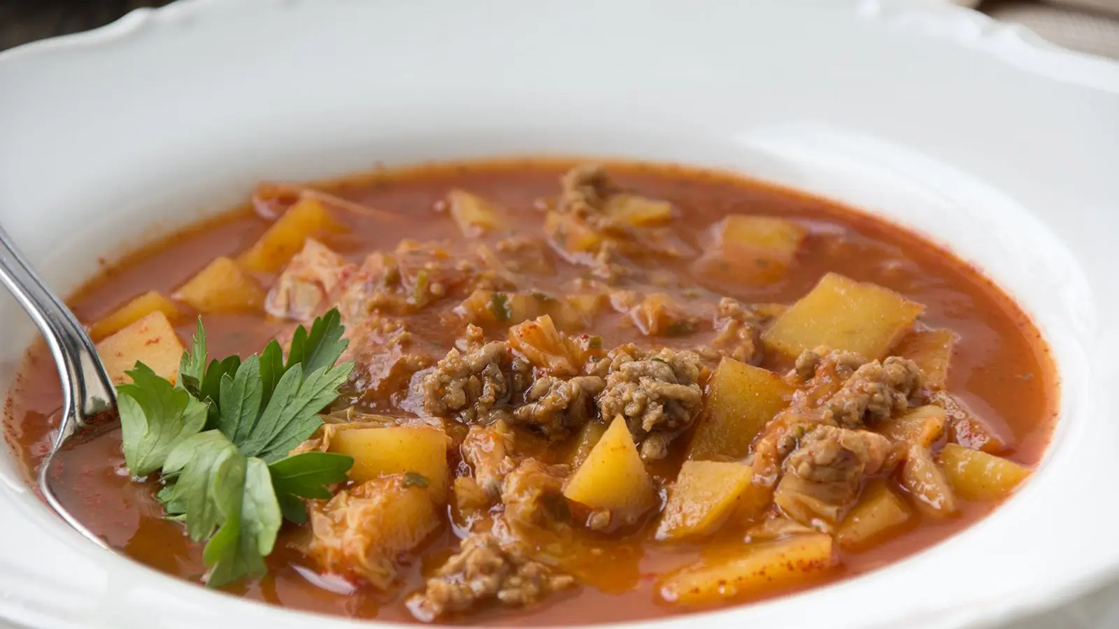 In einem großen Topf die gehackten Zwiebeln andünsten. Das Hack dazugeben und anbraten. Nach und nach den kleingeschnittenen Kohl zugeben und etwas mitbraten, damit er etwas anbräunt. Gemüsebrühe und kleingeschnittene Tomaten dazu.
