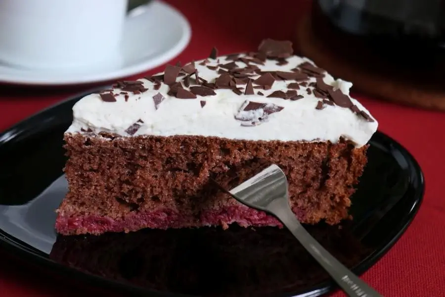 3. Jetzt den erkalteten Kuchen mit der Milch beträufeln und über Nacht langsam durchziehen lassen. Am nächsten Tag Sahne mit Sahnesteif steif schlagen, den Kuchen damit bestreichen und mit Schokostreuseln bestreuen.