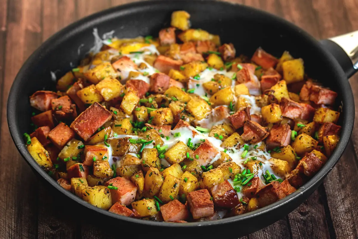Jetzt die noch rohen Kartoffeln schälen und in kleine Stücke schneiden. 1 EL Öl in der Pfanne nochmals erhitzen. Die Kartoffelstücke in die Pfanne geben und unter gelegentlichen Wenden ca. 20 Min. braten.