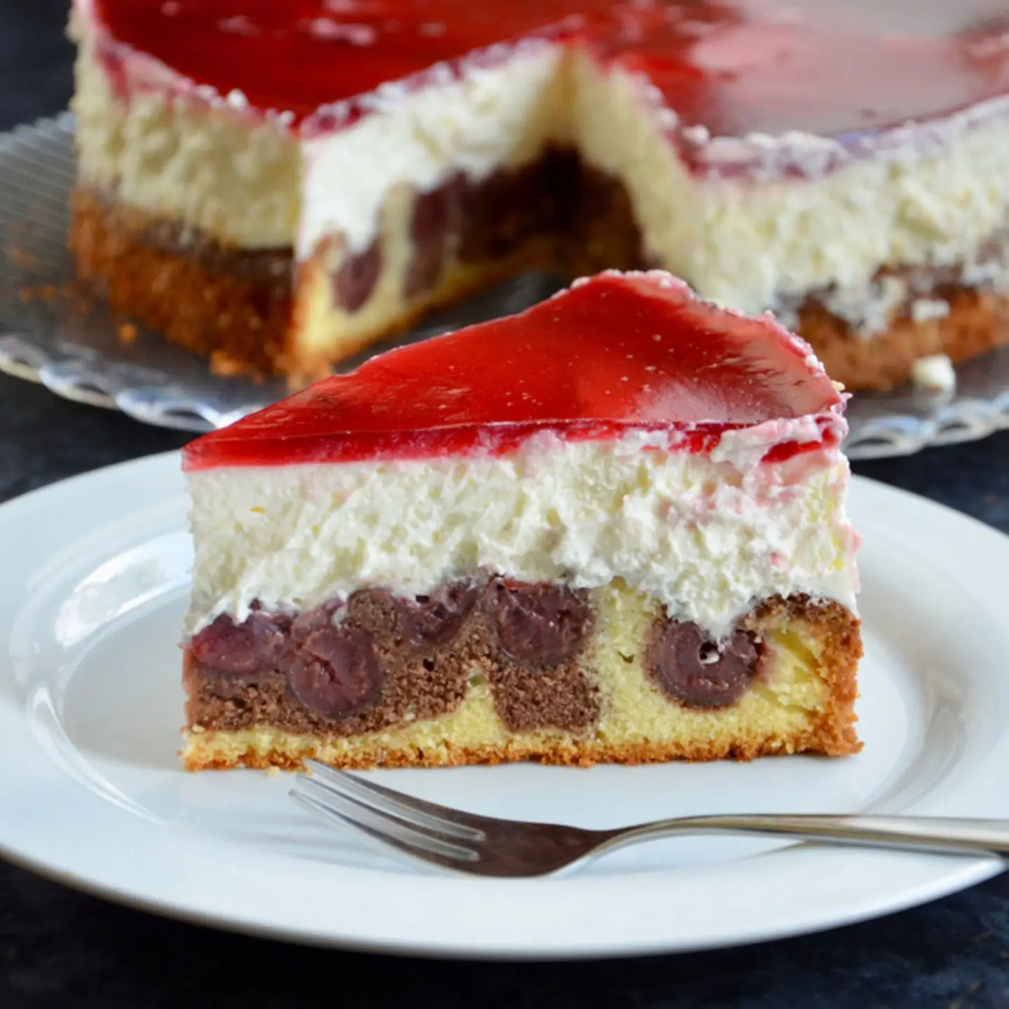 Belag: Sahne und Sahnesteif gut schlagen, Quark, Zucker und Sahnesteif verrühren und die Sahne unterheben. Tortenring um den erkalteten Kuchen legen und die Quarkmasse darauf verteilen. 2-4 Std. kalt stellen. Danach 1/4 l Kirschsaft mit Tortenguss andicken und über den Kuchen verteilen.
