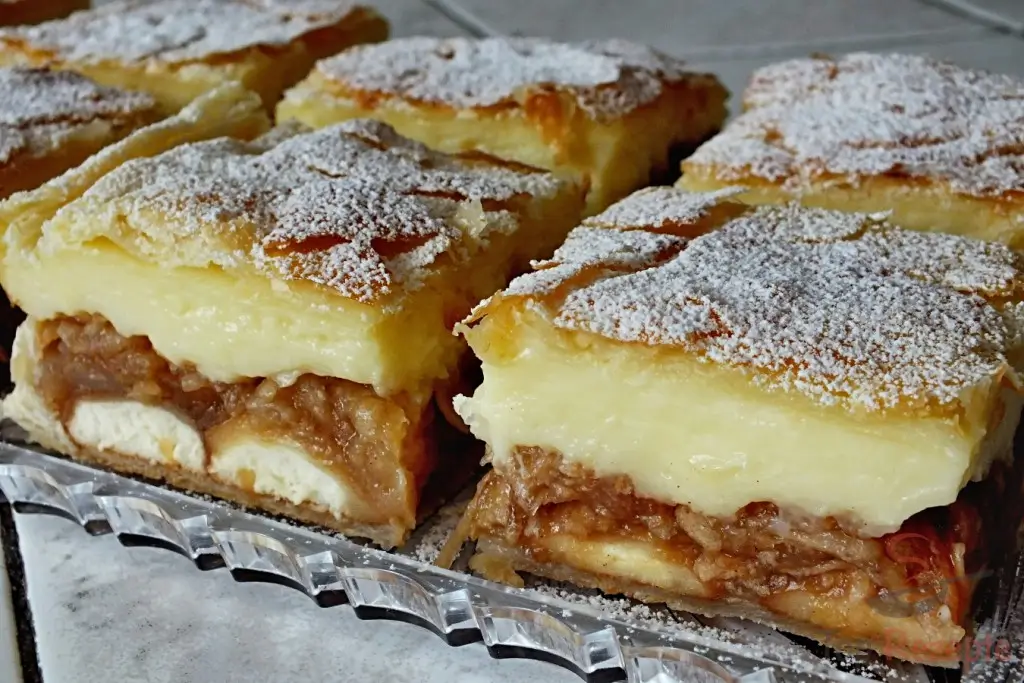 Dann wird ein Blätterteig ausgerollt und eine geeignete Backform gelegt. Die Äpfel noch mit Zimt und Zucker abschmecken und auf dem Blätterteigboden gleichmäßig verteilen. Darüber wird dann der Vanillepudding verteilt. Abschließend wird der zweite Blätterteig oben darüber gelegt. Die Ränder gut andrücken. Mit einer Gabel im Abstand von ein paar Zentimetern Löcher hineinstechen.