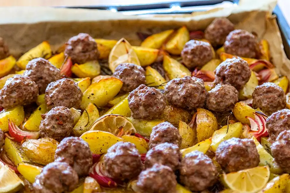Leckere Hackbällchen mit Kartoffeln und Paprikaschoten aus dem Ofen