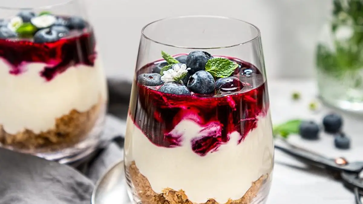 Das abgekühlte Beerenmus über die Creme geben, mit Schlagobers und ein paar Heidelbeeren verzieren, kühl stellen