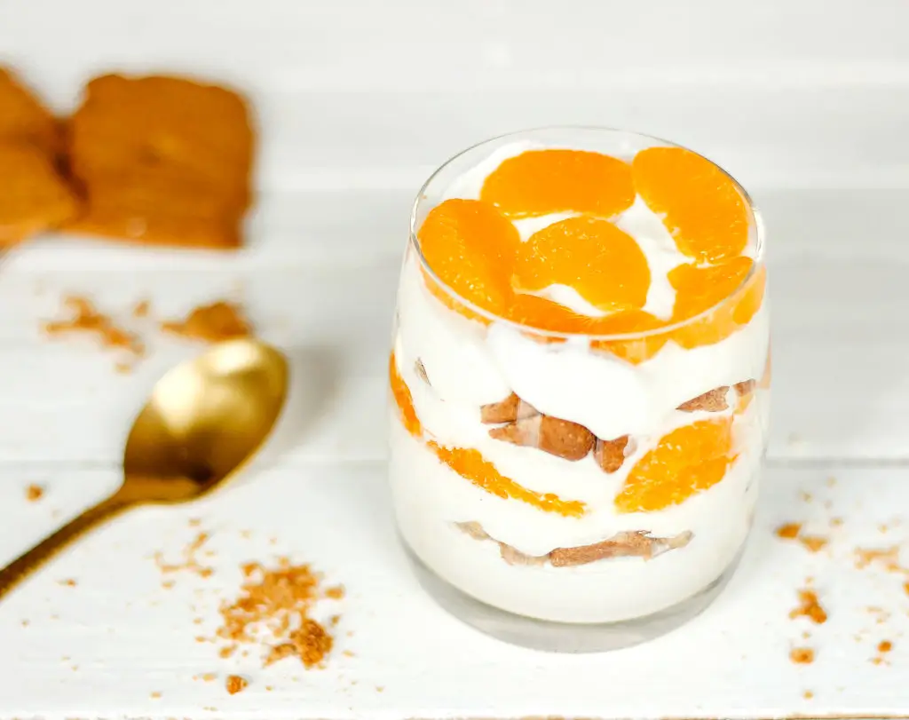 Den Quark mit ein wenig Mandarinensaft und Agavendicksaft süßen und auch drei Packungen Sahnesteif hinzufügen .