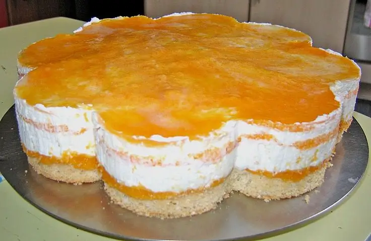 Die Maracuja-Quark-Creme auf dem Biskuitboden verteilen, die zweite Teigplatte mit der Schnittfläche nach unten auf die Füllung legen und diese leicht andrücken.