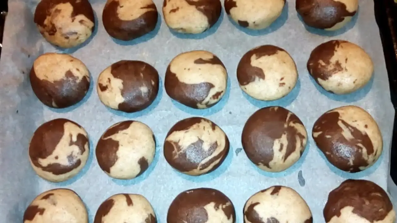 Jetzt für den Schokoteig genauso vorgehen, aber nun 1/2 Päckchen Vanillepuddingpulver und 1 Päckchen Schokopuddingpulver in den Teig geben. Diesen Teig ebenfalls zu einer Kugel formen und kühl stellen.