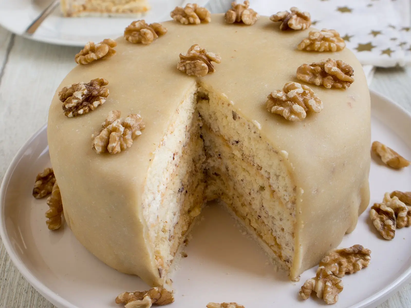 Die Torte ein paar Stunden kalt stellen (evtl. auch über Nacht), dann den Tortenring lösen und abziehen. Die restliche Schlagsahne samt 10 g Zucker und Sofortgelatine aufschlagen und die Torte rundherum damit bestreichen. Den Marzipandeckel auflegen und vorsichtig darüber ziehen. Mit einem Teigschaber die Seiten vorsichtig glätten. Mit einem nassen Messerrücken die Torte in 16 Teile markieren, mit 16 Sahnetupfen verzieren und in diese je eine Walnuss legen.