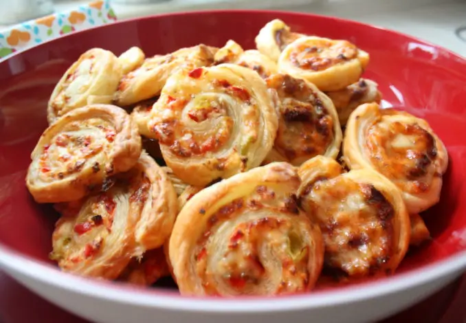 Den Blätterteig ausrollen und das Mett auf dem ganzen Blätterteig gleichmäßig verteilen. Die Zwiebel klein würfeln und auf dem Mett verteilen. Dann den geriebenen Käse auf dem Ganzen verteilen und den Blätterteig mit dem Belag wieder aufrollen (nicht zu locker rollen).