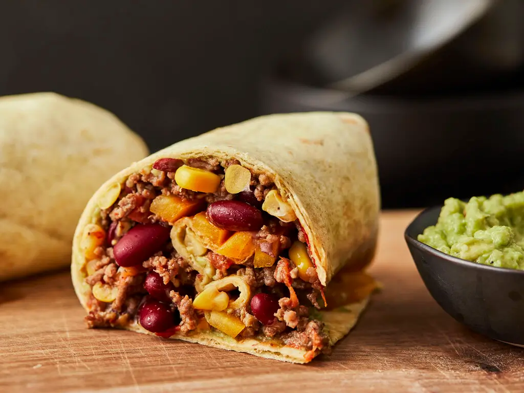 Nun mit den Gewürzen und etwas Zucker abschmecken. Danach die Tortillas mit der Crème fraîche bestreichen und die Hackfleischmasse gleichmäßig darauf verteilen. Mit etwas geriebenem Käse bestreuen. Die Tortillas zu Burritos aufrollen und in eine Auflaufform legen.