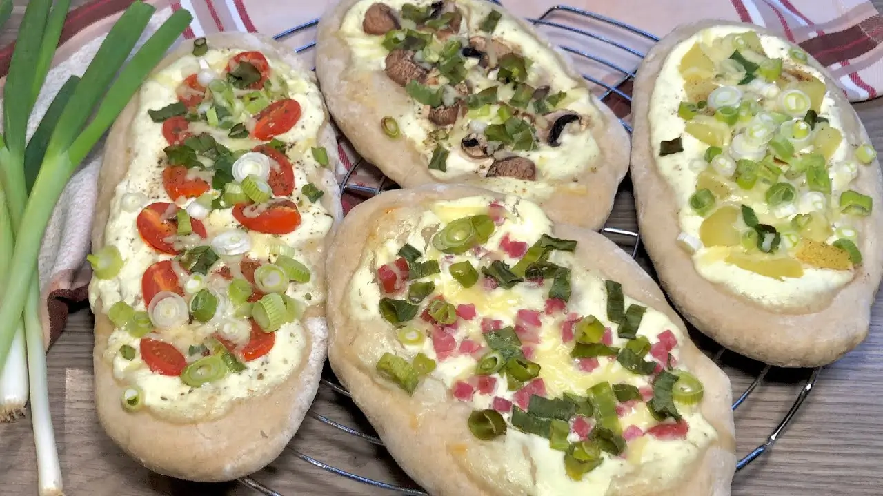 Jetzt werden die Fladen bei ca. 210° Ober-Unterhitze 25 – 30 Minuten gebacken. Dann auf die fertig gebackenen Fladen streut man anschließend dann Lauchzwiebelringe (bzw. Zwiebelringe).