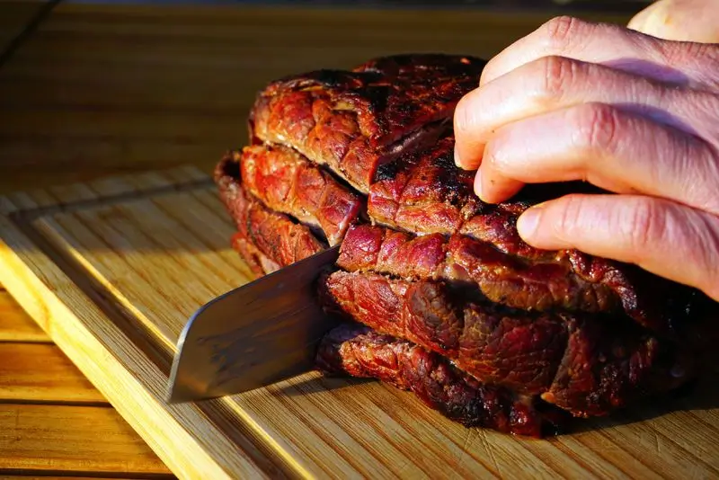 Den Braten herausnehmen und die Bänder entfernen.Die Soße passieren, abschmecken und evtl. binden.