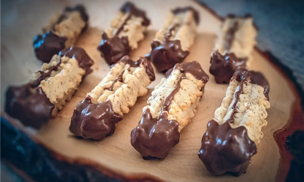 In der Zwischenzeit die Zartbitterschokolade klein schneiden oder brechen und über einem Wasserbad zum Schmelzen bringen. Die Enden der Nougatstangen in die geschmolzene Schokolade tauchen und auf einem Backpapier trocknen lassen.