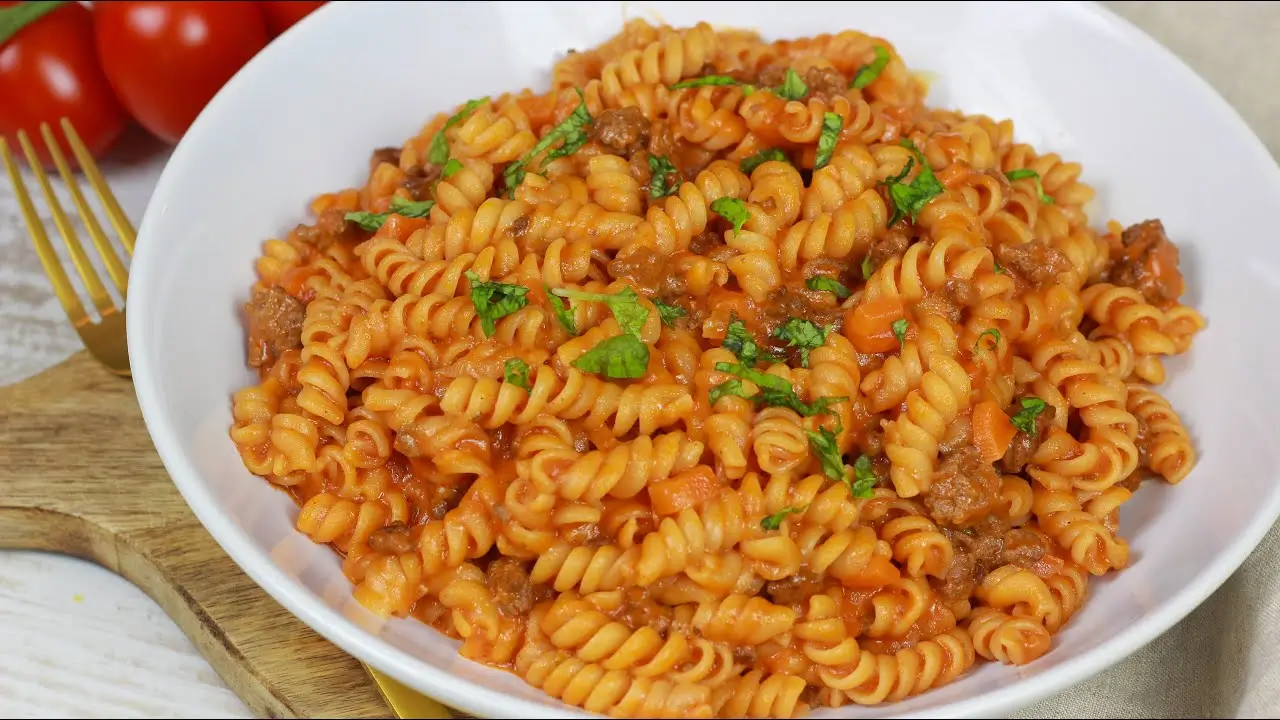 Nudeln mit Joghurt vermischen und nacheinander Hack, Nudeln, Paprikabutter und Tomaten aud die Teller verteilen. Genießen.