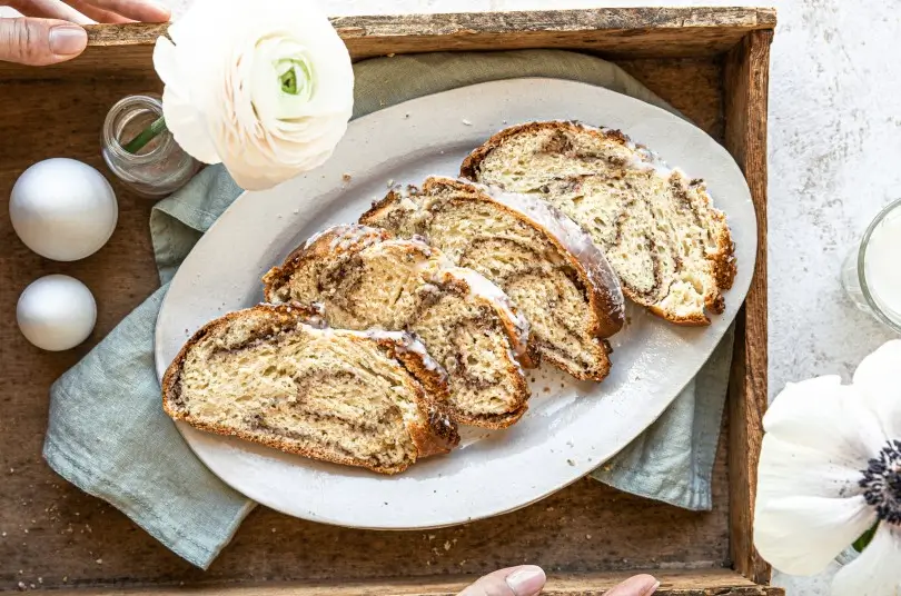 Den Nusskranz zweimal durchschneiden, auf den untersten Teil die Hälfte der weißen Creme streichen, den Mittelteil aufsetzen und mit der Kakaocreme, von der ein Rest zurückgelassen wird, bestreichen. Nun den oberen Kuchenteil darauf setzen und mit der zweiten Hälfte der weißen Creme den ganzen Nusskranz bestreichen. Außen mit fein geraspelter Kuvertüre Vollmilch bestreuen und oben mit dem Rest der Kakaocreme verzieren.