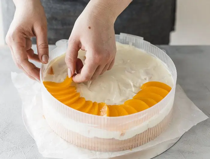 Pfirsiche abtropfen lassen, in kleine Würfel schneiden und sanft unter die Creme rühren. Die Creme nun auf dem mit Aprikosenkonfitüre bestrichenem Nusskuchen mit dem Teigschaber verteilen. Mit einem Messer oder einer Teigkarte glatt streichen. Sahne steif schlagen und auf der Creme verstreichen. Nach Fantasie verzieren.
