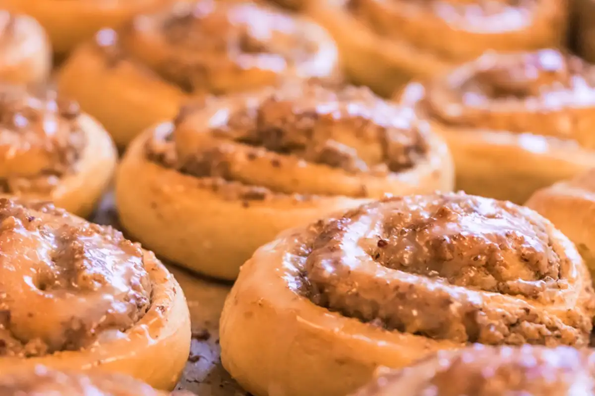 Den gegangenen Teig zu einer großen Platte auswellen. Die Füllung gleichmäßig verteilen und die Platte zu einer großen Rolle rollen. Mit einem Messer nicht zu dicke Scheiben schneiden, diese auf Backpapier legen und bei 175°C ca. 25 Minuten goldgelb backen.