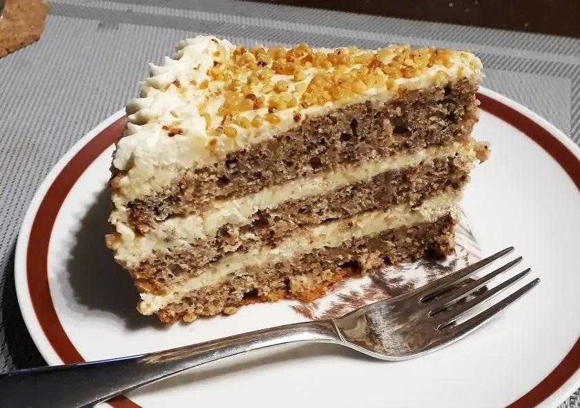 Den Zucker mit den Eigelben schaumig rühren, die Nüsse, Semmelbrösel und das Bittermandelöl zugeben. Die Eiweiße mit dem Zucker steif schlagen, unter die Eigelbmasse heben und in die Form füllen. (Vorsicht: Der Teig ist sehr ergiebig, nicht zu viel in die Form füllen, da Überlaufgefahr)