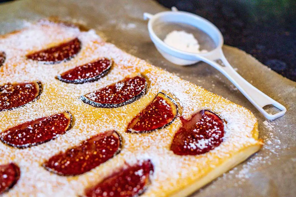 Aus allen Zutaten einem glatten Teig rühren und auf ein gut gefettetes Blech (auf hohen Rand achten, mind. 2,5 cm) gießen. Das Blech anschließend in den auf 200 – 220°C vorgeheizten Ofen schieben. Nach 25 – 30 min. sind die Pfannkuchen fertig. Das Blech dafür heraus nehmen und den Pfannkuchen in beliebig große Stücke schneiden.