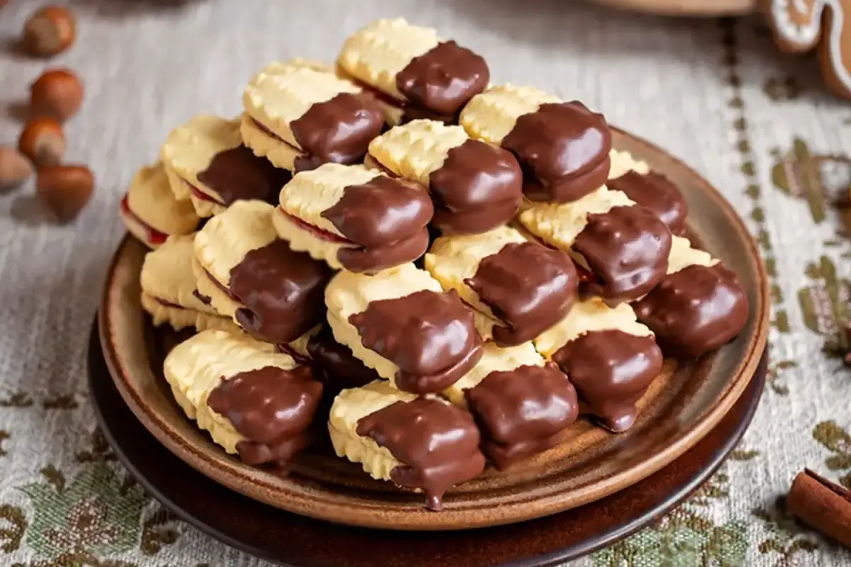 3. Nach dem Abkühlen immer zwei Häufchen mit Marmelade zusammensetzen und die Hälfte in dunkle Schokolade tauchen.