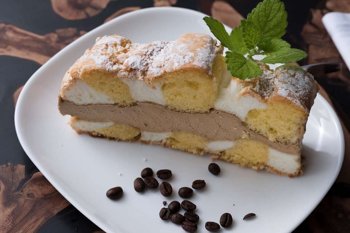 Diese dick mit Aprikosenkonfitüre bestreichen und dann mit einer Mischung aus Schlagsahne, die mit löslichem Kaffee, Vanillezucker aromatisiert wurde, zusammensetzen.